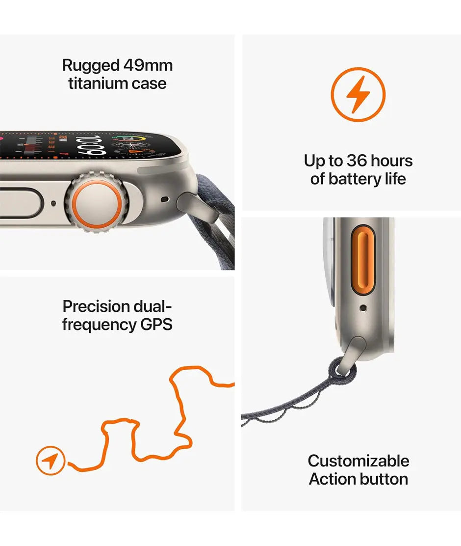 La aventura continúa. El Apple Watch más fuerte y equipado desafía los límites una vez más. Caja de 49 mm resistente y ligera, hecha de titanio de calidad aeroespacial. |