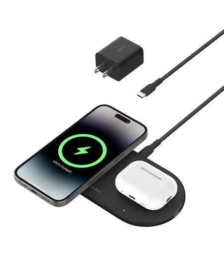 - Carga rápida 2 en 1: configura tu iPhone, Samsung o dispositivo compatible con Qi2 hasta 15 W en este cargador mientras te preparas y disfrutas de la compatibilidad MagSafe, incluso con la funda puesta. Además, la almohadilla Qi de 5 W carga AirPods u otro dispositivo al mismo tiempo.