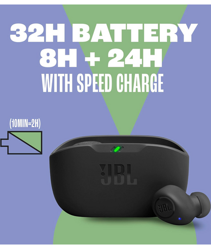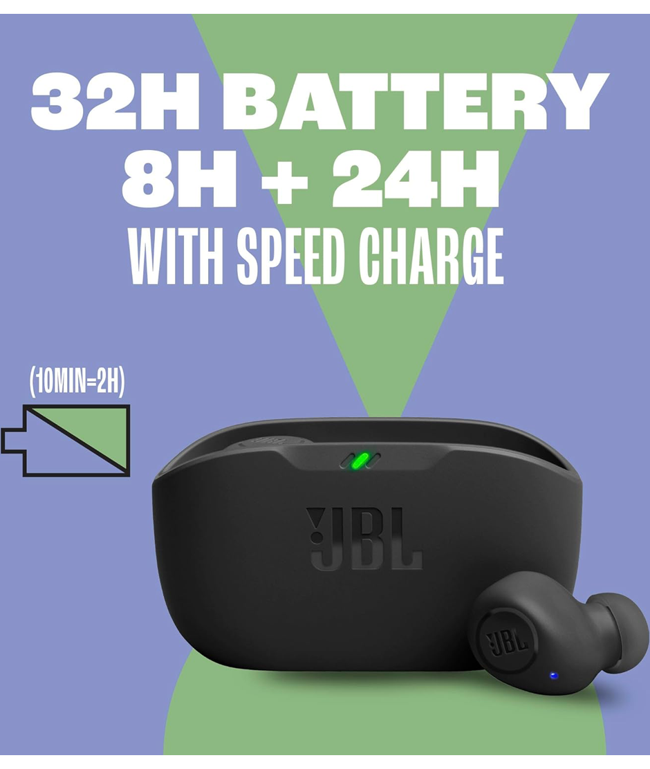 Sonido JBL Deep BassSaca el máximo partido a tus mezclas con audio de alta calidad de auriculares seguros y fiables con drivers de 8 mm con sonido JBL Deep Bass. Ajuste cómodoEl diseño ergonómico de los auriculares JBL Vibe Buds se ajusta tan cómodamente que te olvidarás de que los llevas puestos. El diseño de los auriculares sella suavemente tus oídos bloqueando los ruidos externos y mejorando el rendimiento de los bajos. Batería de hasta 32 (8h + 24h) horas con carga rápidaCon 8 horas de autonomía de la batería en los auriculares y 24 en el estuche, los JBL Vibe Buds proporcionan audio durante todo el día. Y cuando necesites más potencia, puedes acelerar la carga con dos horas adicionales de potencia en solo 10 minutos.