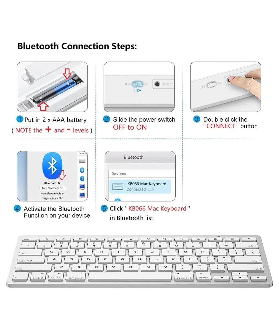 - Pasos de conexión Bluetooth: ① Coloca 2 pilas AAA, ② Deslice el interruptor de encendido: apagado a encendido, ③ Haz doble clic en el botón "CONECTAR", ④ Activa la función Bluetooth en tu dispositivo, ⑤ Haz clic en "Teclado KB066 Mac" en la lista Bluetooth, conéctalo con éxito al dispositivo
